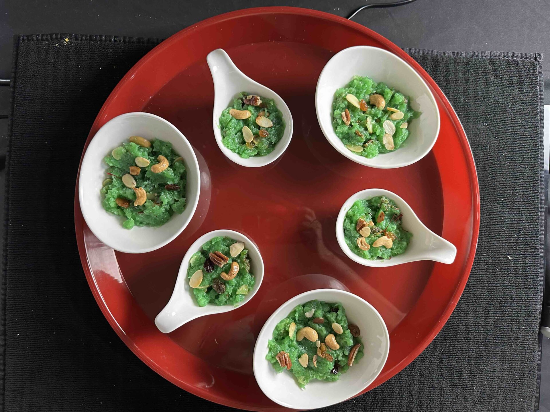The addition of fried nuts—peanuts, cashews, and almond flakes—gives a delightful crunch and elevates the dish, making every bite a celebration of textures. The optional green food coloring not only enhances the visual appeal, but it also gives a nod to the traditional festive appearance of the halwa.