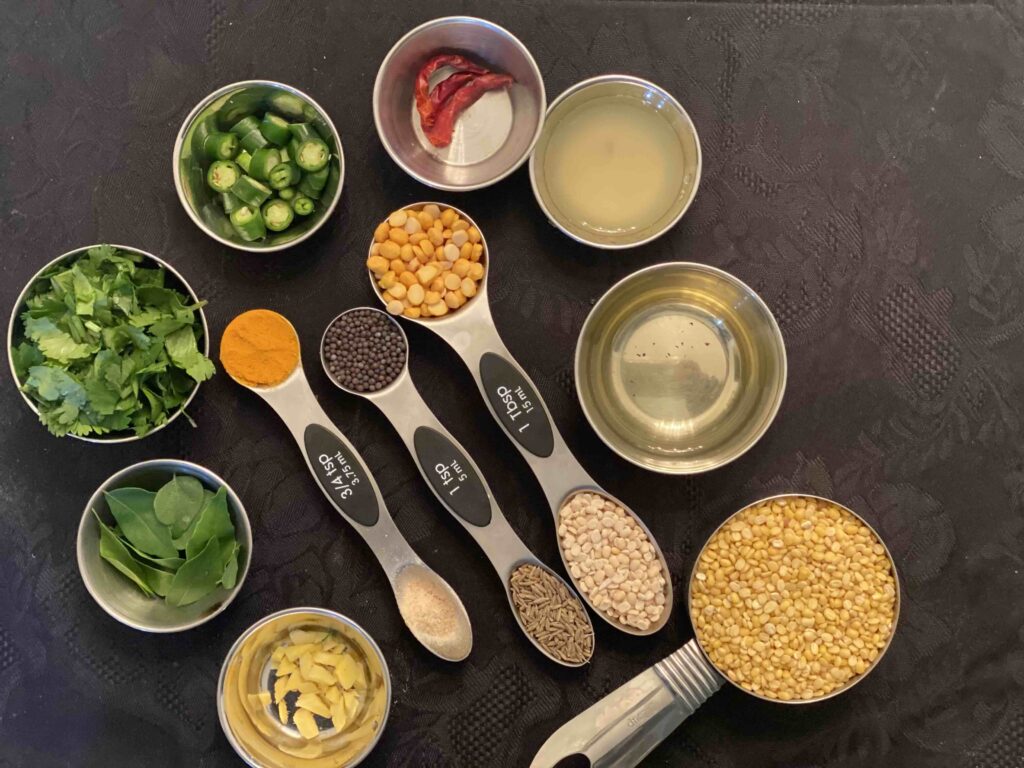 - Heat 1 tsp oil and put the red chillies, mustartd seeds. When the seeds splutter, add chana dal and urad dal. Then add chopped greenchillies and ginger. Add curry leaves and turmeric powder.