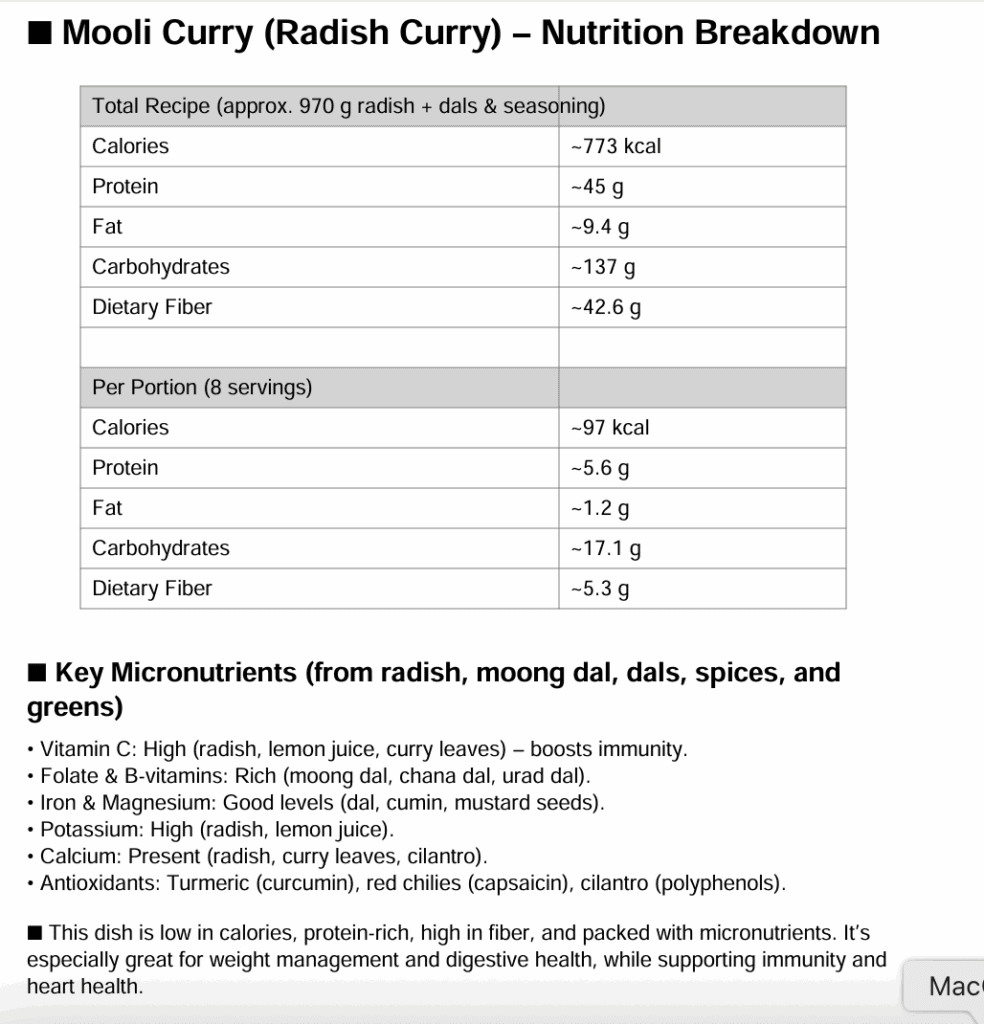 - ముల్లంగి: 2 పెద్దవి తురుముకట్టినవి = 970 గ్రాములు