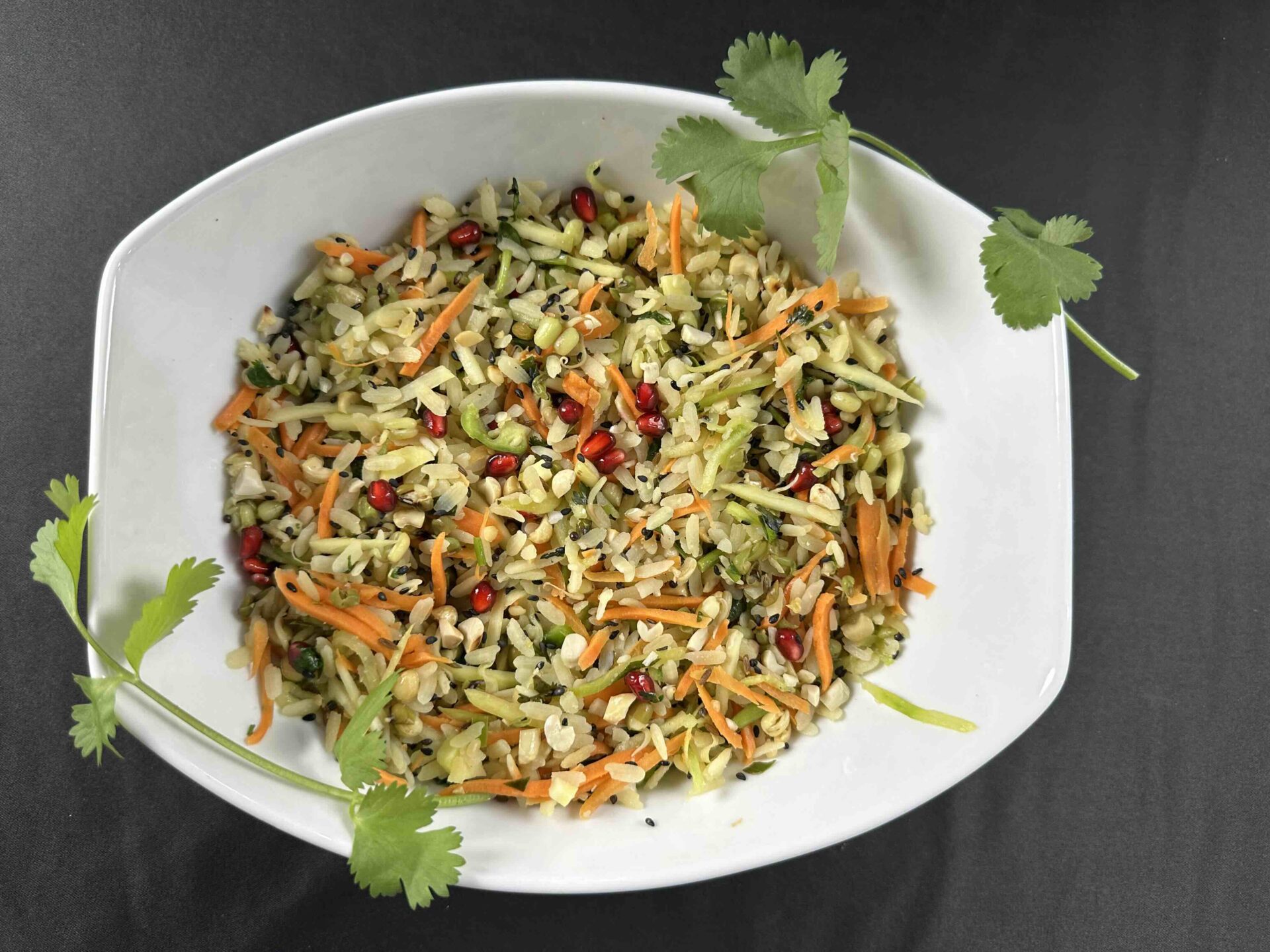This vibrant and nutritious Poha Salad is a delightful blend of textures and flavors, perfect for a light meal or a refreshing snack. Made with the versatile poha, or flattened rice, this dish serves as a canvas for a medley of crunchy and colorful ingredients. The poha is soaked and combined with the earthy crunch of chopped peanuts and the sweetness of pomegranate seeds. Shredded carrots and cucumbers add a refreshing crispness, enhancing the salad’s visual appeal with their vivid colors.